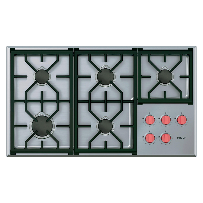 О товареГазовая варочная панель WOLF, красные ручки, линия Professiona. 5 двухуровневых герметичных конфорок. Режимы "Томления" и "Плавления" для ультраделикатного нагрева, имитирующего водяную баню.Чугунные решётки с фарфоровым напылением.